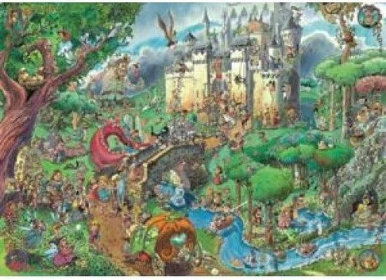 Heye puzzel van Prades genaamd Fairy Tales, met een drukke afbeelding vol met sprookjesfiguren. Hoeveel herken jij er?