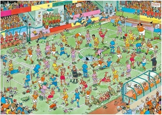 Jan van Haasteren WK Vrouwenvoetbal Puzzel 1000 Stukjes. Jan van Haasteren tekent al decennia lang humoristische platen die je steeds weer verrassen en laten lachen. De echte fans kennen de specifieke kenmerken van Jan van Haasteren en zoeken in elke puzzel direct naar de haaienvin, Sinterklaas, de handjes, het kunstgebit en Jan’s zelfportret. Jumbo heeft tientallen Jan van Haasteren puzzels in de collectie van 54 tot maar liefst 5.000 puzzelstukjes.
