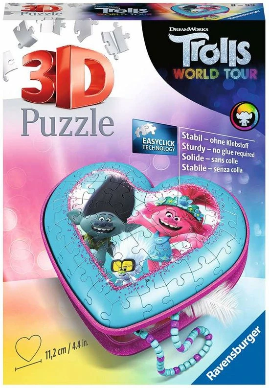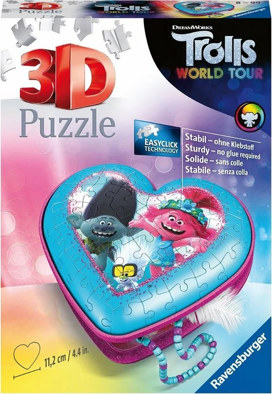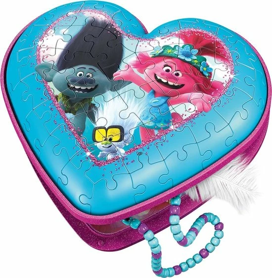 Echt voor meisjes! Met 54 kunststof puzzelstukjes maak je een prachtig stevig hartendoosje met gaaf Trolls 2 Word Tour design, dat iedere meisjeskamer een coole look geeft. Gewoon puzzelen, accessoires aanbrengen en klaar is het doosje. Door het scharnier kun je het doosje heel makkelijk open en dicht doen. Perfect voor al je mooie spulletjes! Voor meisjes vanaf 7 jaar.