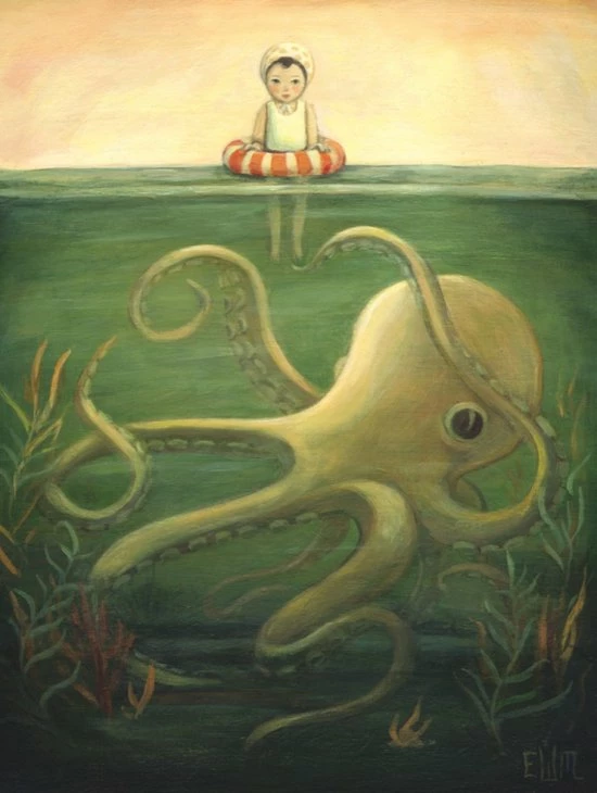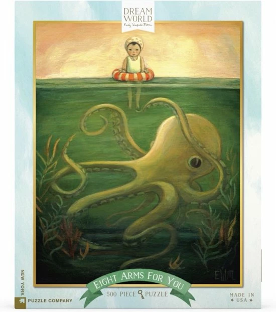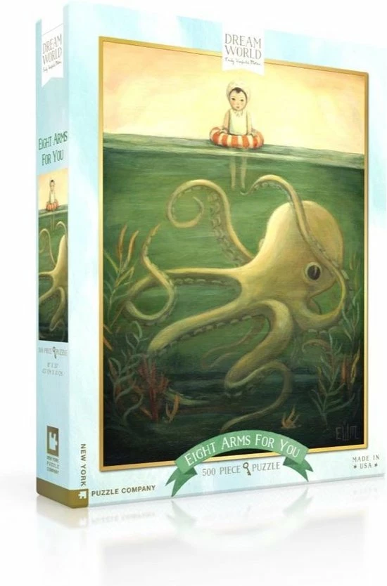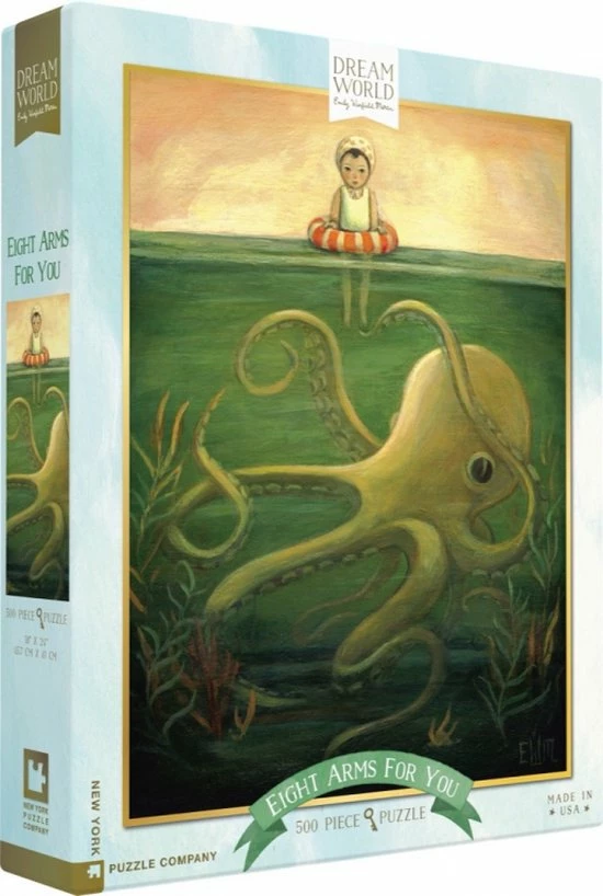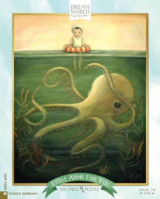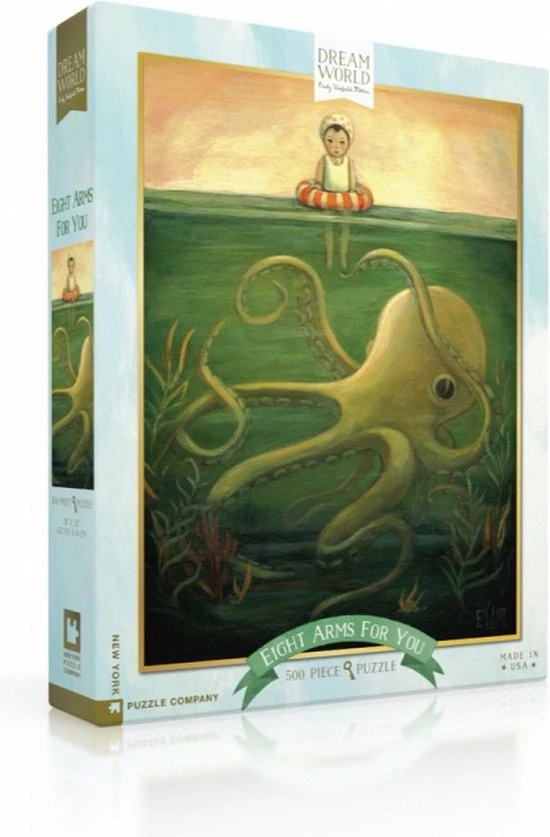 Deze jonge zwemmer die op het wateroppervlak drijft is zich niet bewust van de acht armen van de monsterlijke octopus die beneden op de loer ligt. Deze puzzel van New York Puzzle Company heeft 500 stukjes en heeft een linnen stijl afwerking zodat de puzzel minder glimt. Aanbevolen leeftijd: 10+ jaar.