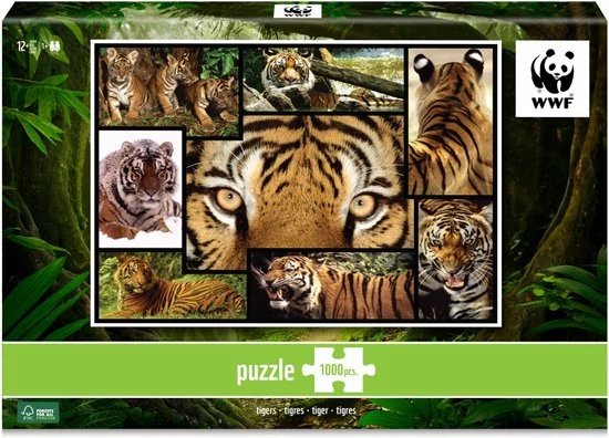 Prachtige tijger puzzel van 1000 stukjes met prijswinnende foto’s van WWF-fotografen.